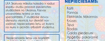 Pagājušajā un šajā nedēļā Latvijā ierodas studenti no Ukrainas, kuri uzsāks studijas Latvijas Kultūras akadēmijā. Tā kā dienesta viesnīcā ir pieejamas tikai pamata mēbeles, aicinām LKA studentus, pasniedzējus, darbiniekus iesaistīties atbalsta akcijā un palīdzēt sagādāt nepieciešamākos sadzīves priekšmetus ērtākas ikdienas nodrošināšanai.