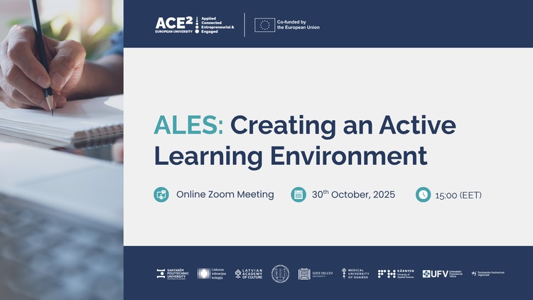 30. oktobrī plkst. 15.00–17.00 norisināsies tiešsaistes mācības “Aktīvas mācīšanās vides veidošana” (Creating an Active Learning Environment), ko organizē Karintijas Lietišķo zinātņu universitāte (Carinthia University of Applied Sciences) Eiropas Universitāšu alianses ACE²-EU ietvaros. Divu stundu ilgais kurss ir daļa no mācību cikla “Aktīvās mācīšanās e-pedagoģijas skola” (Active Learning e-Pedagogy Schools – ALES), kuras mērķis ir stiprināt pedagoģisko prasmju pilnveidi un veicināt aktīvās mācīšanās pieeju izmantošanu studiju procesā.