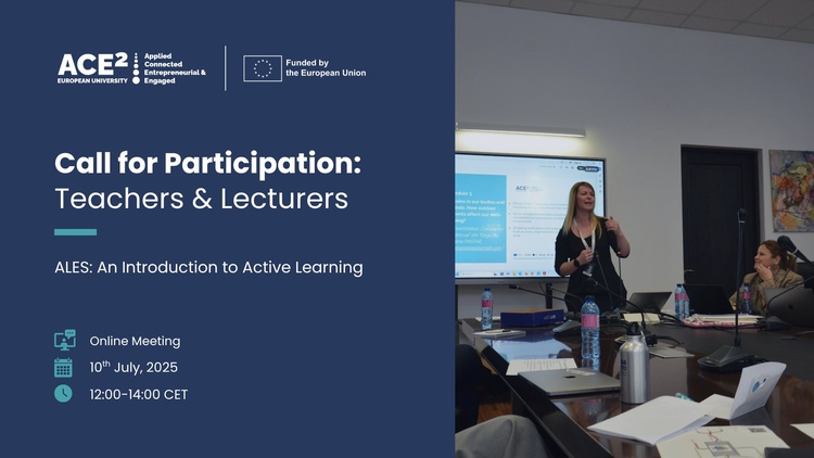 Eiropas Universitāšu alianses ACE²-EU aktīvās mācīšanās e-pedagoģijas skola (Active Learning E-PEDAGOGY SCHOOL – ALES) aicina piedalīties kursā "Ievads aktīvajā mācīšanā", kas notiks tiešsaistē 2025. gada 10. jūlijā no plkst. 13.00 līdz 15.00. Kurss notiks angļu valodā. Aicinām reģistrēties dalībai šodien, 9.jūlijā, aizpildot tiešsaistes pieteikuma formu: https://forms.gle/MgJzUqD7pbqdEEz87. Noklausoties kursu un piedaloties grupu uzdevumos, kursa dalībnieki saņems apliecinājumu par dalību. Kursu organizē “Constantin Brâncuși” Târgu-Jiu universitāte, Rumānija.