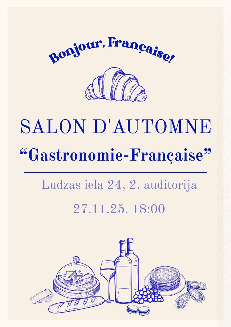 Ceturtdien, 27.novembrī, plkst. 18.00 Latvijas Kultūras akadēmijas 2.auditorijā (Ludzas ielā 24) norisināsies bakalaura studiju apakšprogrammas “Starpkultūru sakari” specializāciju Latvija–Francija un Latvija–Francija/Kanāda otrā un ceturtā kursa studentu organizēts pasākums “Rudens salons 2025 – gastronomie française”.