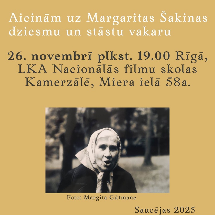 Latvijas Kultūras akadēmijas tradicionālās dziedāšanas grupa “Saucējas” aicina uz Ziemeļlatgales teicējas Margaritas Šakinas (1926-2014) simtgades ieskandināšanai veltītu dziesmu vakaru, kas notiks trešdien, 26. novembrī, plkst. 19.00 Latvijas Kultūras akadēmijas Nacionālās filmu skolas Kamerzālē, Miera ielā 58a, Rīgā.
