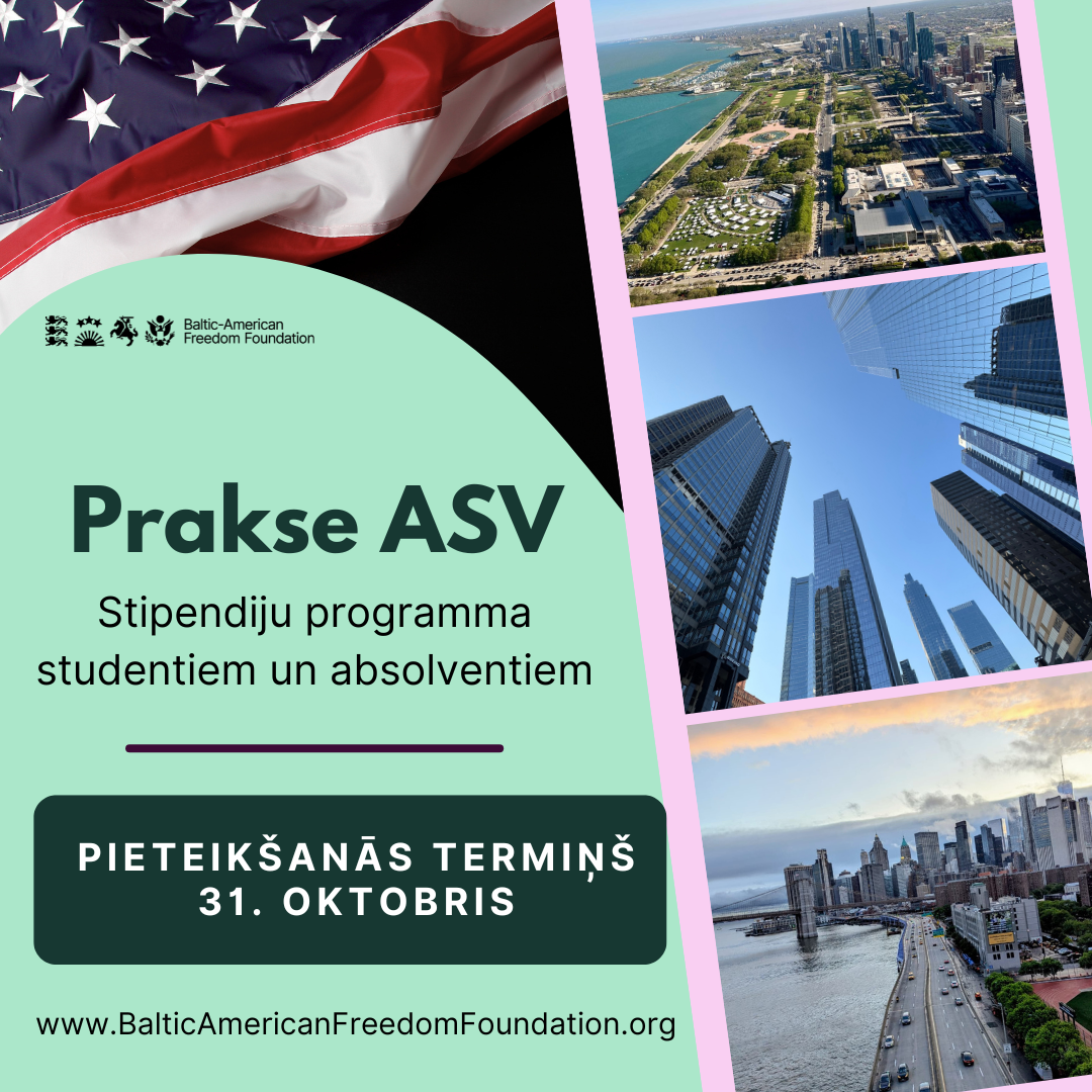 Pieteikšanās BAFF Profesionālās prakses programmas stipendijai norisināsies līdz 31. oktobrim, piesakoties elektroniski. Plašāka informācija fonda mājaslapā www.BalticAmericanFreedomFoundation.org