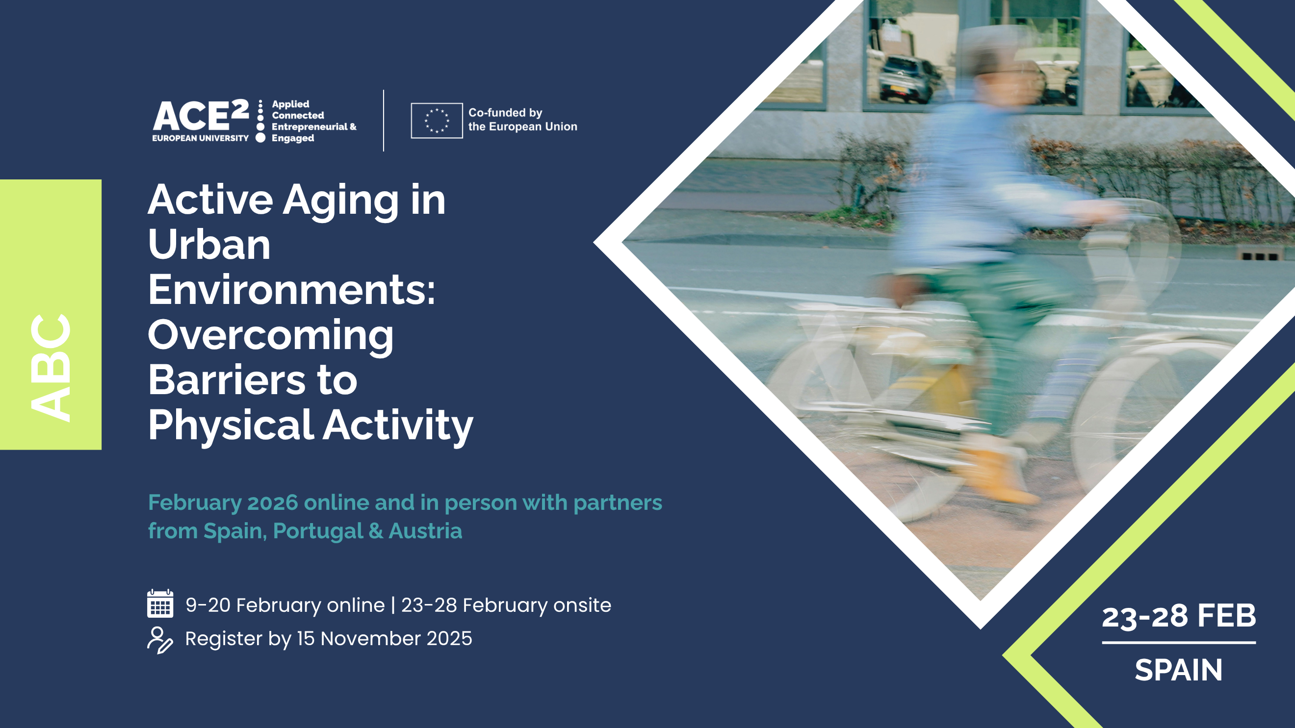 Apraksts: Programmas mērķis ir izprast, kā pilsētvide ietekmē vecāka gadagājuma cilvēku veselību un labklājību, kā arī attīstīt praktiskas prasmes aktīvas novecošanas veicināšanā. Studenti analizēs reālus izaicinājumus, kas ierobežo fizisko aktivitāti pilsētās, un izstrādās radošus, kopienās balstītus risinājumus veselīgākas un iekļaujošākas vides veidošanai. Programmas laikā dalībnieki strādās starpdisciplinārās komandās, piedalīsies semināros, darbnīcās un vizītēs pie nozares profesionāļiem, kā arī pilnveidos savas prasmes projektu plānošanā, komunikācijā un sadarbībā.