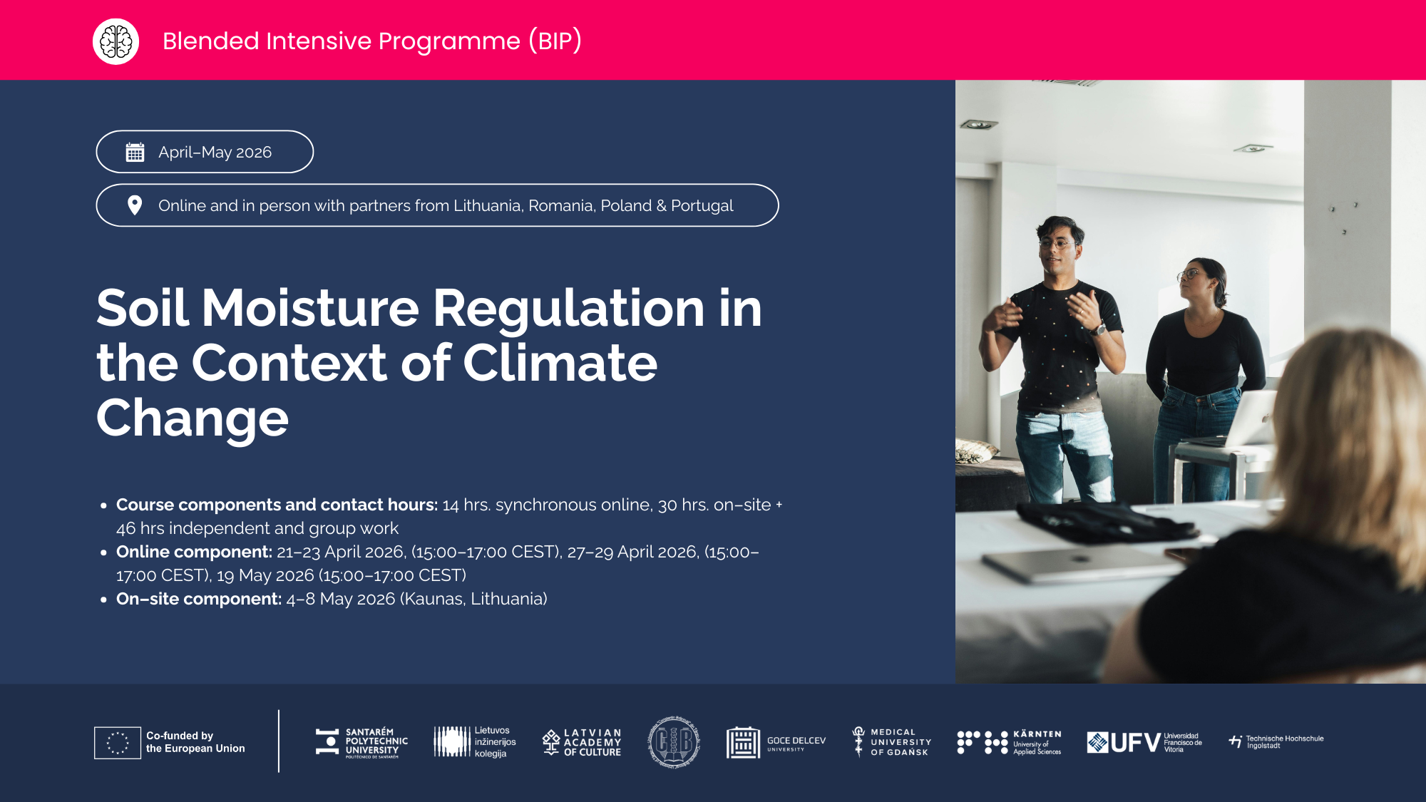 Apraksts: Programmas mērķis ir stiprināt studentu profesionālās kompetences, lai veicinātu ilgtspējīgu sabiedrību attīstību, apvienojot teorētiskas zināšanas ar praktisku darbību un starpdisciplināru sadarbību. Dalībnieki iepazīs Eiropas Savienības pieeju ilgtspējai, tiesisko un politisko ietvaru, kā arī strādās starptautiskās komandās, lai izstrādātu inovatīvus risinājumus reāliem vietējās kopienas izaicinājumiem. Programma ietver tiešsaistes nodarbības, klātienes sesijas un refleksijas aktivitātes, kas palīdzēs studentiem attīstīt kritisko domāšanu, radošumu, projektu vadības prasmes un spēju kļūt par pārmaiņu veicinātājiem savās sabiedrībās.