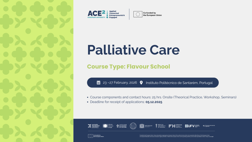 Apraksts: Programmas mērķis ir izpētīt, kā veselības aprūpes profesionāļi un radošo nozaru speciālisti var sadarboties, lai nodrošinātu kvalitatīvu un iekļaujošu paliatīvo aprūpi. Studenti analizēs reālas situācijas, kurās identificētas ciešanas fiziskā, psiholoģiskā, sociālā vai garīgā līmenī, un izveidos starpdisciplināras pieejas, kas orientētas uz pacienta un ģimenes vajadzībām. Programmas gaitā dalībnieki darbosies komandās, piedalīsies semināros, darbnīcās un vietējo aprūpes iestāžu vizītēs, pilnveidojot savas prasmes komunikācijā, ētiskā lēmumu pieņemšanā un starpdisciplinārā sadarbībā.