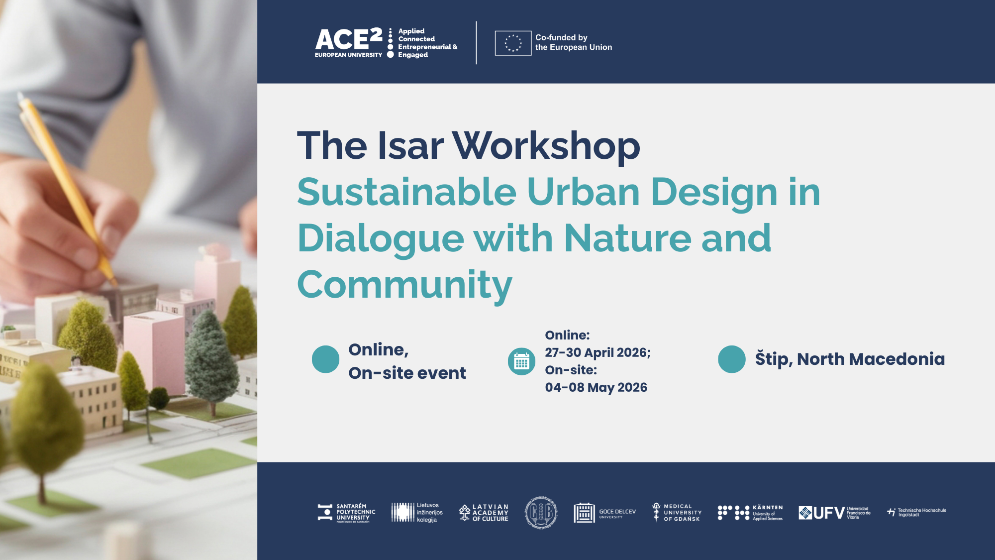 Apraksts: Programma veltīta publisko telpu ilgtspējīgai attīstībai un pārveidei, balstoties reālas vides analīzē. Par programmas gadījuma izpētes vietu kalpos Isar kalns un upes krasta teritorija Štipā (Ziemeļmaķedonijā), kur studenti analizēs, kā pilsētvides dizains, infrastruktūra, ģeodēziskā uzmērīšana un vides ilgtspēja var tikt integrēti drošu, pieejamu un noturīgu publisko telpu veidošanā.