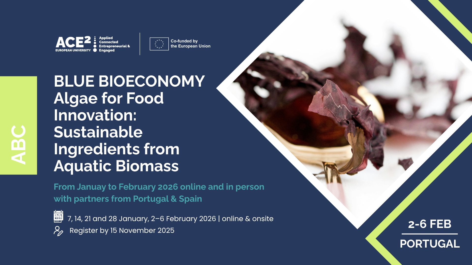 Organizē: Instituto Politécnico de Santarém sadarbībā ar Universidad Francisco de Vitoria Vairāk informācijas: https://www.ace2eu.eu/event/blue-bioeconomy-algae-for-food-innovation-sustainable-ingredients-from-aquatic-biomass/