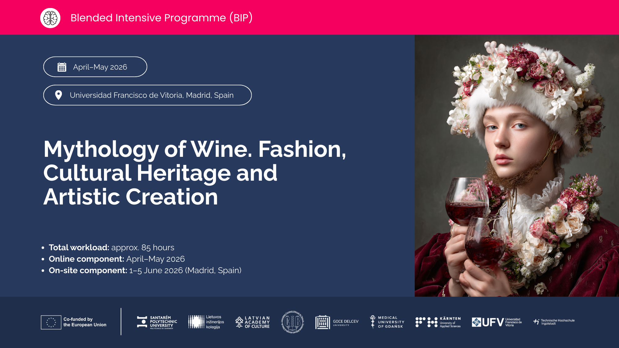 Apraksts: Programmas mērķis ir iepazīstināt studentus ar kultūras mantojuma, mitoloģijas un radošās prakses savstarpējo mijiedarbību, analizējot vīna simbolisko nozīmi Eiropas kultūrā un tās interpretāciju modes, mākslas un dizaina kontekstā. BIP ietvaros studenti starptautiskās un starpdisciplinārās komandās pētīs, kā vīna mitoloģija un ar to saistītais nemateriālais kultūras mantojums var kļūt par iedvesmas avotu ilgtspējīgai radošajai praksei un laikmetīgai modes izpausmei.