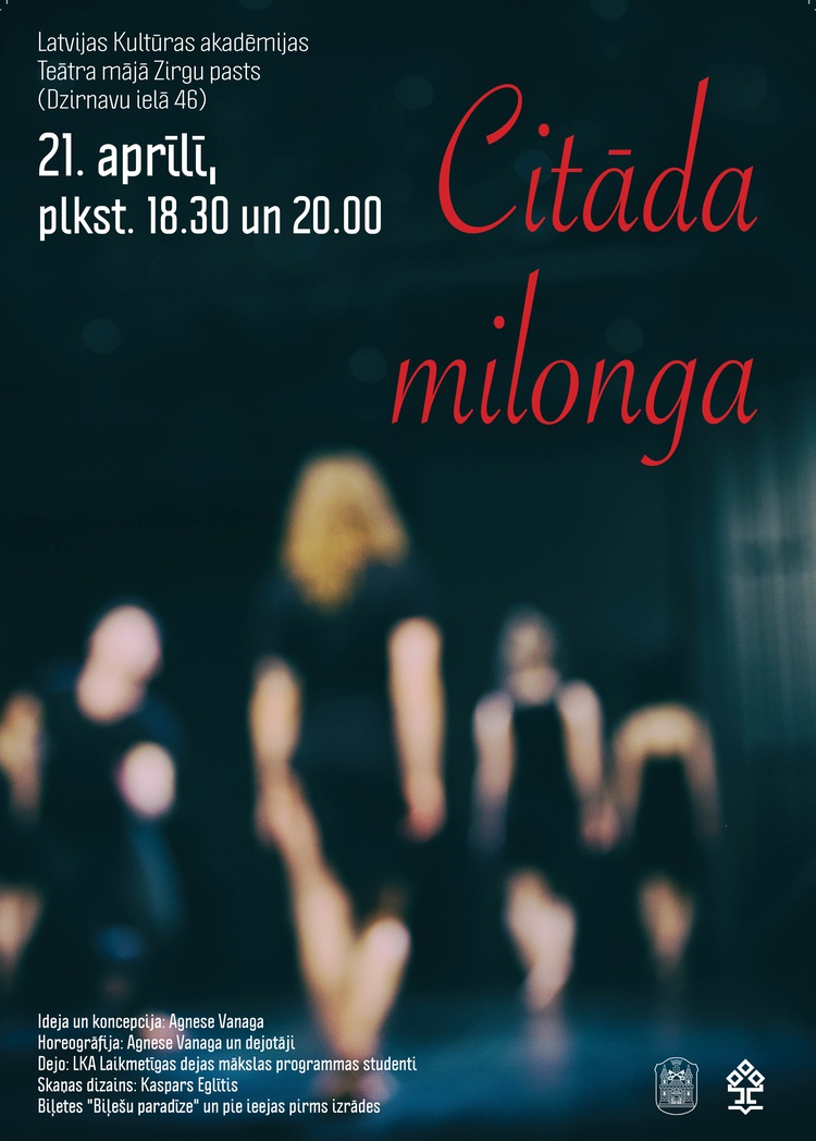 21. aprīlī plkst. 18.30 un 20:00 Latvijas Kultūras akadēmijas Teātra mājā Zirgu pasts (Dzirnavu iela 46) pirmizrādi piedzīvos dejas izrāde ‘’Citāda milonga’’, apvienojot divus šķietami nesavienojamus dejas stilus - tango un hip – hop. Abi dejas stili ir savulaik imigrantu radīti, kur, sasaucoties ar mūsdienu situāciju Eiropā, dejā veido papildu dialogu, parāda savstarpējās komunikācijas nozīmību un katra viedokļa svaru lēmumu pieņemšanā.