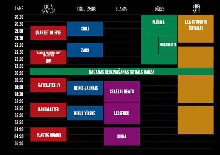 Jau 11 gadus LKA studenti un mācībspēki atver akadēmijas durvis ikvienam interesentam un piedāvā kārtīgu devu kultūras. Šogad muzikālo programmu veidos tādi mākslinieki kā SATELLITES LV, BANDMASTER, REINIS JAUNAIS, PLŪSMA, LESSFUCC, CRYSTAL BEATS, KIRHA, QUARTET OF FIVE, kā arī jauno izpildītāju konkursa “Iesildām Valpurģus 2017” uzvarētāji “IOV” un citi. Šī gada organizatori vēlas, lai interesanti ir dažādu gaumju pārstāvjiem, tāpēc būs iespējams gan baudīt mierīgāku atmosfēru tradicionālajā Chill Zonā, gan arī ļauties ātrākiem mūzikas ritmiem Slazda Zonā, kas šajā gadā pirmo reizi vērs savas durvis.