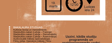 2016. gada 19. martā, sestdien, no plkst. 12:00 līdz 15:30 Latvijas Kultūras akadēmijā (Ludzas ielā 24) notiks Informācijas diena. Aicināts ir ikviens, kurš vēlas noskaidrot visu par studijām un uzņemšanu Latvijas Kultūras akadēmijā (LKA) bakalaura, maģistra un doktora studijās 2016. gadā. Informācijas dienas apmeklētājiem būs iespēja uzzināt, kādos studiju virzienos iespējams uzsākt studijas un kādas ir prasības iestājpārbaudījumos. Klātienē iepazīstoties ar pasniedzējiem, studiju procesu un studējošo pašpārvaldi, Akadēmija piedāvās izbaudīt radošo atmosfēru un vidi, kas piesaista talantīgus cilvēkus no visas Latvijas iegūt augstāko izglītību tieši LKA. Piedaloties “Radošajās orientēšanās” sacensībās, Informācijas dienas apmeklētāji varēs laimēt balvas un uzzināt interesantas lietas par Akadēmiju, tās personībām un nozīmīgākajiem notikumiem. “Sarunu koridorā” apmeklētājiem būs iespēja satikt studentus, kas dalīsies savā pieredzē par studijām un Akadēmijas vidi. Reģistrēšanās laikā, no plkst. 11:00 līdz 12:00, zālē būs iespēja vērot LKA studentu īsfilmas.