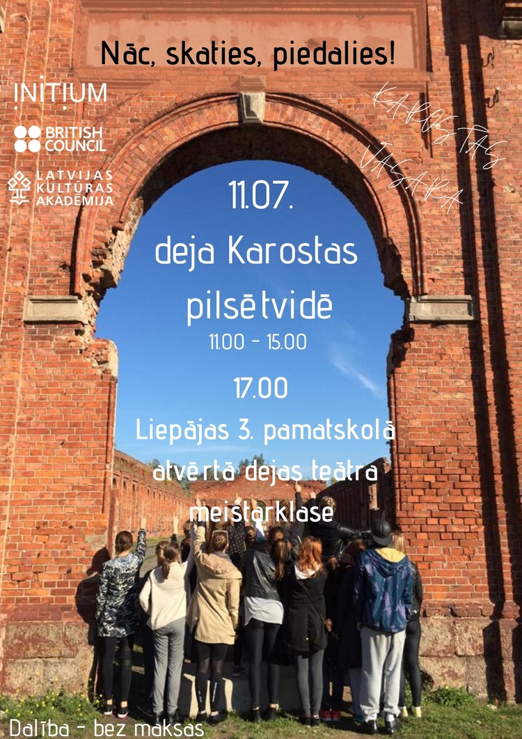 11.07., piedaloties notikumu sērijā “Karostas vasara”, fonds INITIUM sadarbībā ar Latvijas Kultūras akadēmijas Laikmetīgās dejas mākslas studentiem piedāvās dejas performances Karostas pilsētvidē. Performances paredzētas dažādās vietās no plkst. 11.00 - 15.00.