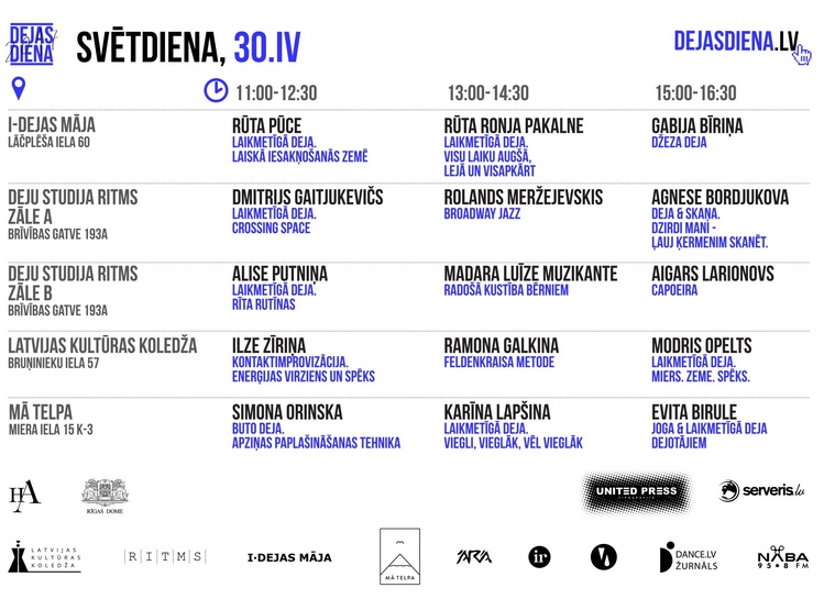 Ar meistarklašu saturu, pašiem meistariem, norises vietām un precīzu laika plānu var iepazīties www.dejasdiena.lv