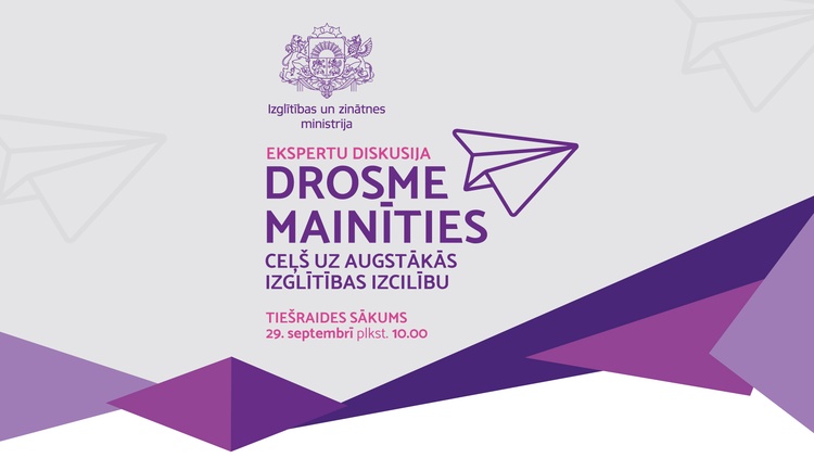 Trešdien, 2021. gada 29. septembrī,no plkst. 10.00 līdz 12.00 Izglītības un zinātnes ministrija aicina ikvienu sekot līdzi tiešsaistes diskusijai “Drosme mainīties–ceļš uz augstākās izglītības izcilību”. Diskusijas dalībnieki spriedīs par faktoriem, kas iezīmē augstākās izglītības kvalitāti, kā arī par instrumentiem, kurus izmantot, tuvinot Latvijas augstskolu sistēmu izcilībai un nodrošinot starptautisku konkurētspēju.