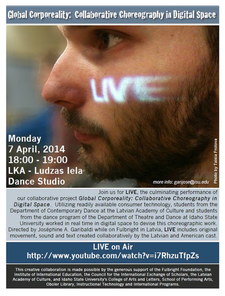 Latvijas Kultūras akadēmijā šajā semestrī ar Laikmetīgās dejas horeogrāfijas studentiem Fulbraita programmas ietvaros strādā viesprofesore Dr. Žozefine Garibaldi (Josephine A.Garibaldi) no ASV. Viens no Žozefīnes uzdevumiem ir organizēt un vadīt lekciju kursu online vienlaicīgi Akadēmijas un Idaho State University studējošajiem un pirmdien, 7. aprīlī plkst. 18:00 ikvienam ir iespēja izsekot šī projekta noslēgumam, vērojot to tiešraidē internetā: https://www.youtube.com/watch?v=i7RhzuTfpZs