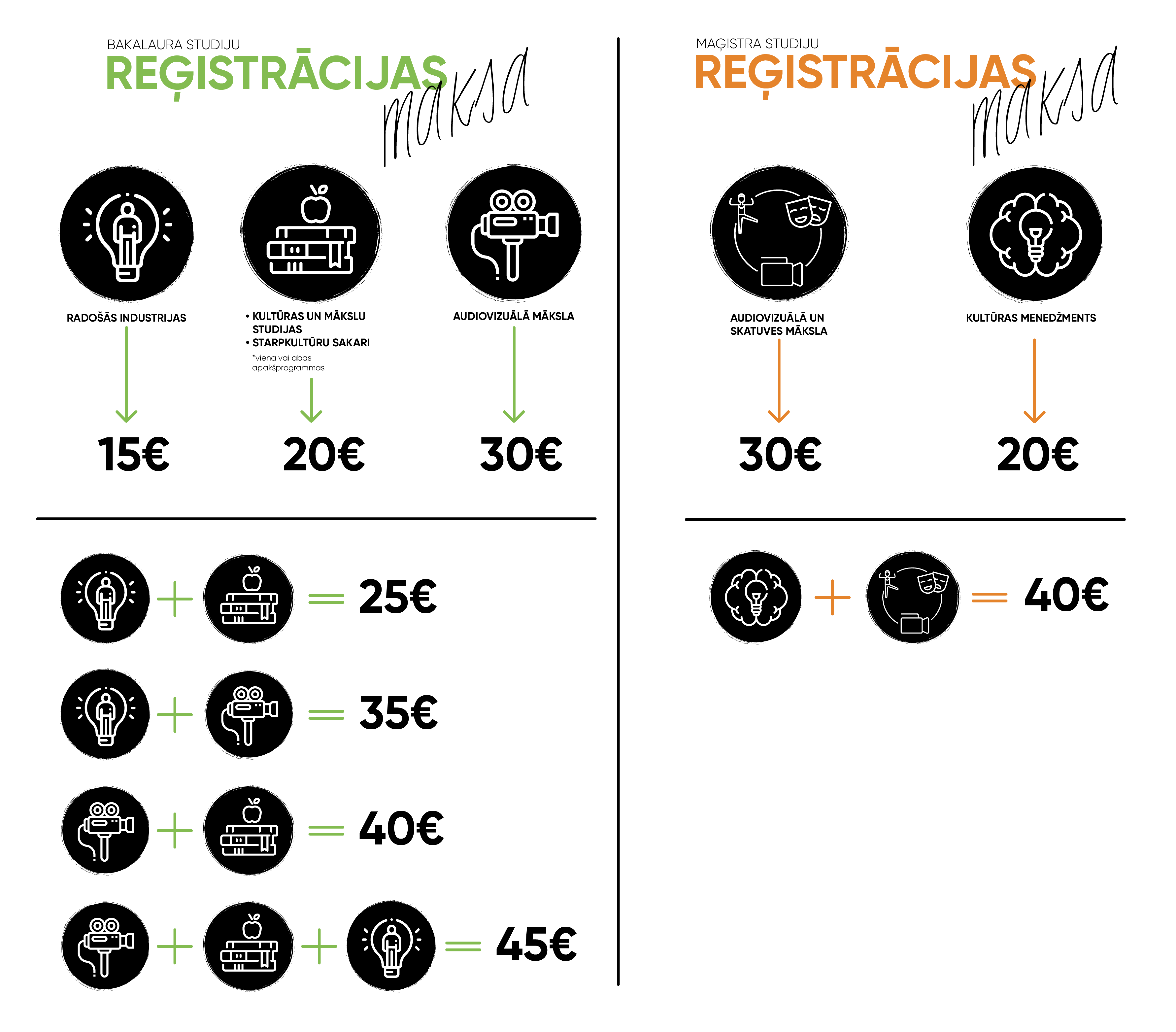 Elektroniskā pieteikšanās sistēma aprēķina un norāda, kāda reģistrācijas maksas summa jāiemaksā, lai reģistrētos konkursam izvēlētajās programmās, kā arī rekvizītus maksājuma veikšanai. Reģistrācijas maksa ir atšķirīga dažādās studiju programmās, jo atšķiras iestājpārbaudījumu apjoms!