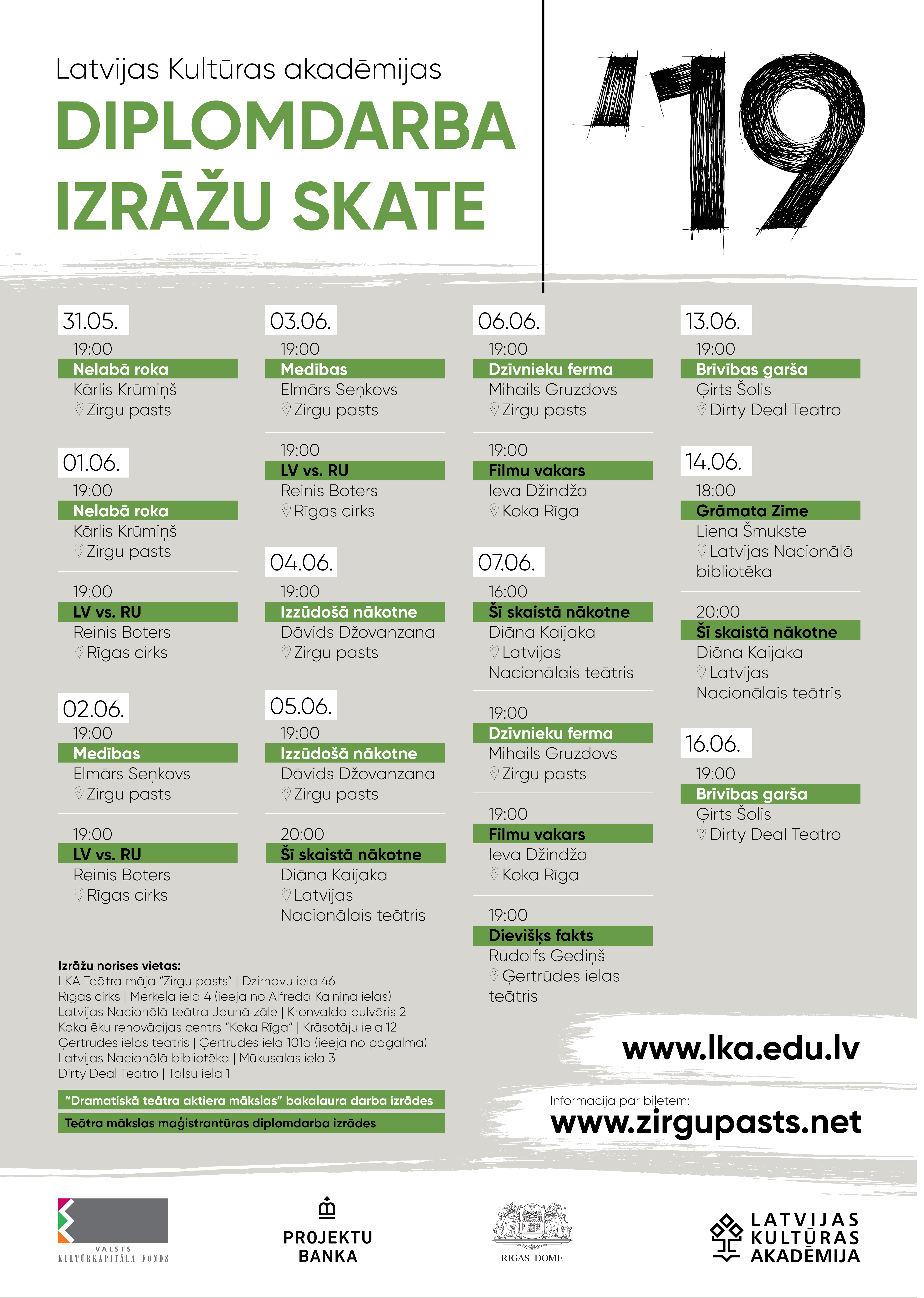 No 2019. gada 31. maija līdz 16. jūnijam Latvijas Kultūras akadēmija (LKA) aicina apmeklēt Dramatiskā teātra aktiera mākslas ar specializāciju leļļu teātra mākslā un Teātra mākslas maģistrantūras topošo absolventu diplomdarba izrādes. Dramatiskā teātra aktieru bakalaura darba izrādes iestudējuši režisori Dāvids Džovanzana (Somija), Mihails Gruzdovs, Kārlis Krūmiņš, Elmārs Seņkovs un Ģirts Šolis. Teātra mākslas maģistru – Reiņa Botera, Pamelas Butānes, Ievas Džindžas, Rūdolfa Gediņa, Diānas Kaijakas un Lienas Šmukstes – diplomdarba izrādes tapušas sadarbībā ar Latvijas Nacionālo bibliotēku, Latvijas Nacionālo teātri, Ģertrūdes ielas teātri, Dirty Deal Teatro, Rīgas cirku un Koka ēku renovācijas centru “Koka Rīga”. LKA diplomdarba izrādes finansiāli atbalsta VKKF, Rīgas dome un “Projektu banka”.
