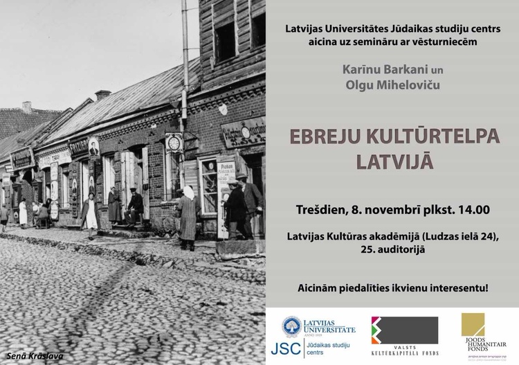 Latvijas Universitātes (LU) Jūdaikas studiju centrs sadarbībā ar Latvijas Kultūras akadēmiju aicina uz semināru “Ebreju kultūrtelpa Latvijā", ko vadīs vēsturnieces Karīna Barkane un Olga Miheloviča. Seminārs notiks trešdien, 8. novembrī, plkst. 14.00 Latvijas Kultūras akadēmijā (Ludzas ielā 24), 25.auditorijā.
