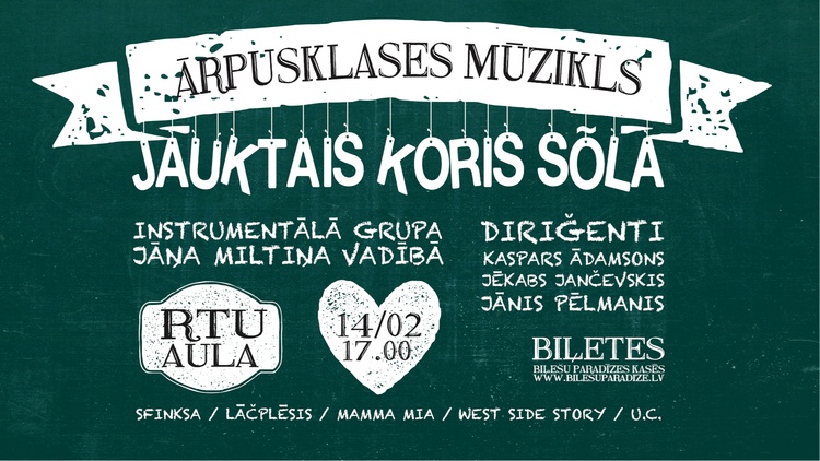 Šā gada Valentīndienā Latvijas Kultūras akadēmijas koris "Sõla" aicina uz skanīgu un jautru koncertu "Ārpusklases mūzikls". Tas notiks Rīgas Tehniskās universitātes Lielajā aulā 14. februārī plkst. 17.00. Koncerta programmā apkopotas dziesmas no mūzikliem un rokoperām. Koncertā piedalīsies arī instrumentālā grupa Jāņa Miltiņa vadībā.