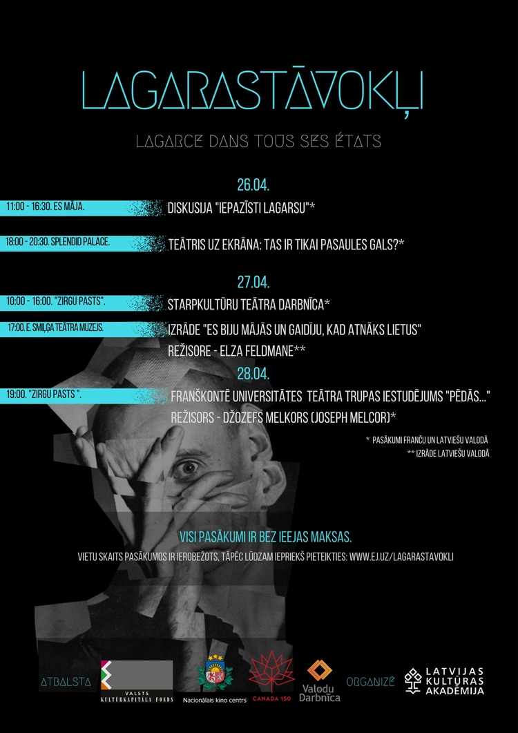 Atzīmējot franču izcilā dramaturga Žana-Lika Lagarsa (Jean-Luc Lagarce) sešdesmit gadu jubileju, Latvijas Kultūras akadēmija organizē festivālu “Lagarastāvokļi”, kas norisināsies no 26. līdz 28. aprīlim.