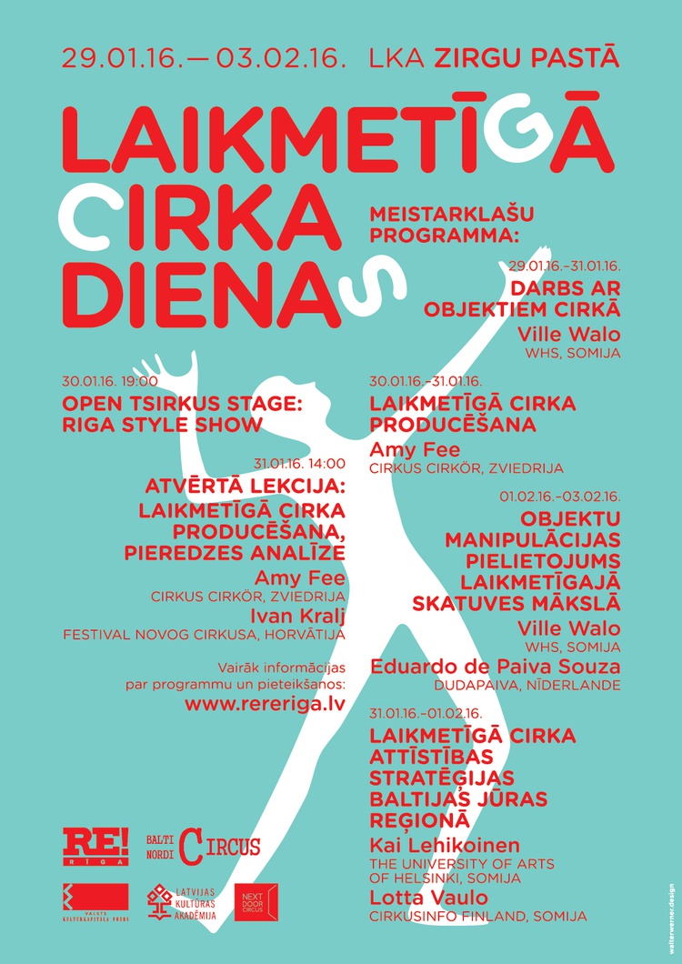 No 29. janvāra līdz 3. februārim Latvijas Kultūras akadēmijas teātra mājā “Zirgu Pasts” Laikmetīgā cirka dienas!, kuras tēmu loks veicinās laikmetīgā cirka attīstību Baltijas jūras reģionā. Tās ietvaros ikviens interesents aicināts 30.janvārī plkst.19:00 piedalīties kolektīvā izrādē Open Tsirkus Stage: Riga Style Show un 31. janvārī plkst. 14.00 pieteikties dalībai publiskajā Amy Fee (Cirkus Cirkor producente) un Ivan Kraj (cirka režisors un producents no Horvātijas) lekcijā par laikmetīgā cirka producēšanu. Plašāk par lekciju: http://rereriga.lv/2016/01/lekcija-laikmetiga-cirka-producesana/.