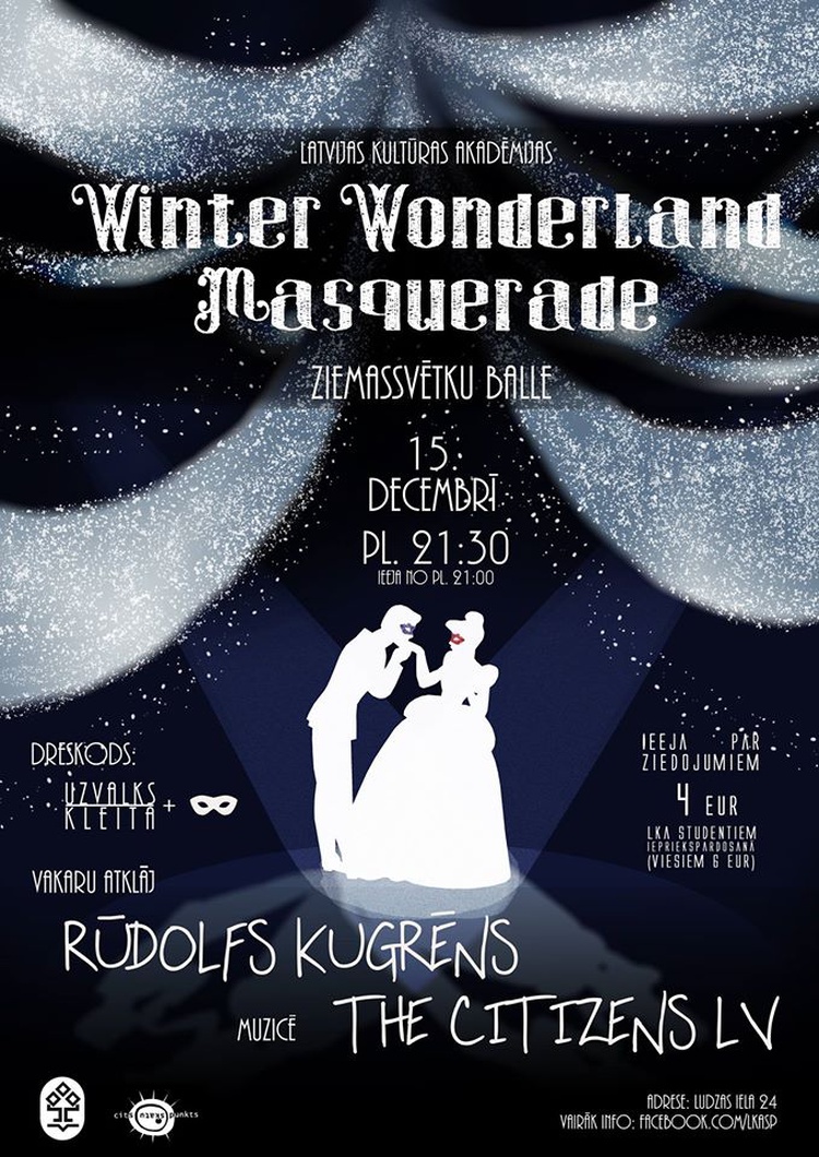 Latvijas Kultūras akadēmijas Studentu pašpārvalde 15. decembrī plkst. 21.30 Ludzas ielā 24 (Ieeja no plkst. 21.00) aicina uz Ziemassvētku balli " "WINTER WONDERLAND MASQUERADE"! Pasākumu atklās komiķis RŪDOLFS KUGRĒNS. Visa vakara garumā deju virpuļos jūs iekustinās mūziķu grupa THE CITIZENS LV! Kā arī būs iespēja uzņemt neaizmirstamus kadrus ar draugiem mūsu maģiskajā fotostūrī, piedalīties dažādās, jautrās aktivitātēs un saņemt vērtīgas balvas!