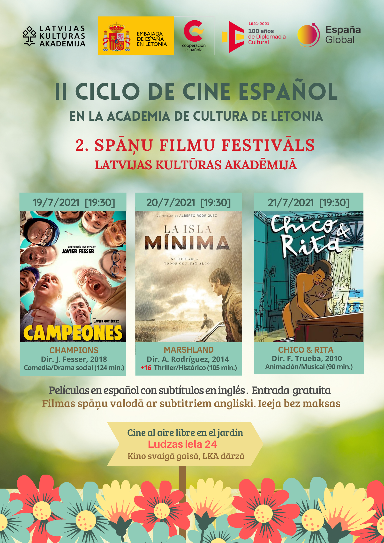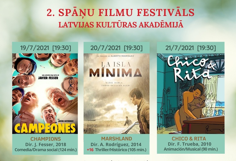 No 19. līdz 21. jūlijam plkst. 19.30 Latvijas Kultūras akadēmijas (LKA) dārzā (Ludzas iela 24) norisināsies otrais spāņu filmu festivāls. Svaigā gaisā ikvienam interesentam būs iespēja izbaudīt dažādu žanru filmas, kas tiek demonstrētas oriģinālvalodā (spāņu) ar subtitriem angļu valodā.
