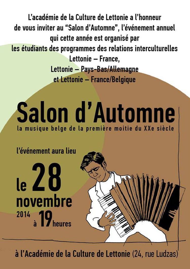 Latvijas Kultūras akadēmijas studenti ielūdz ikvienu piektdien, 28.novembrī plkst. 19:00 uz ikgadējo frankofonās kultūras pasākumu "Rudens salons". Šogad pasākums veltīts beļģu kultūras fenomenam, mūziķim Džango Reinhardam. Starpkultūru sakaru Latvija-Francija, Latvja-Francija/Beļģija un Latvja-Nīderlande/Vācija studenti ar muzikālām un teatrālām performancēm piedāvā pavadīt tumšo novembra vakaru 20.gadsimta sākuma kabarē! Pasākums notiks Ludzas ielā 24 (zālē).