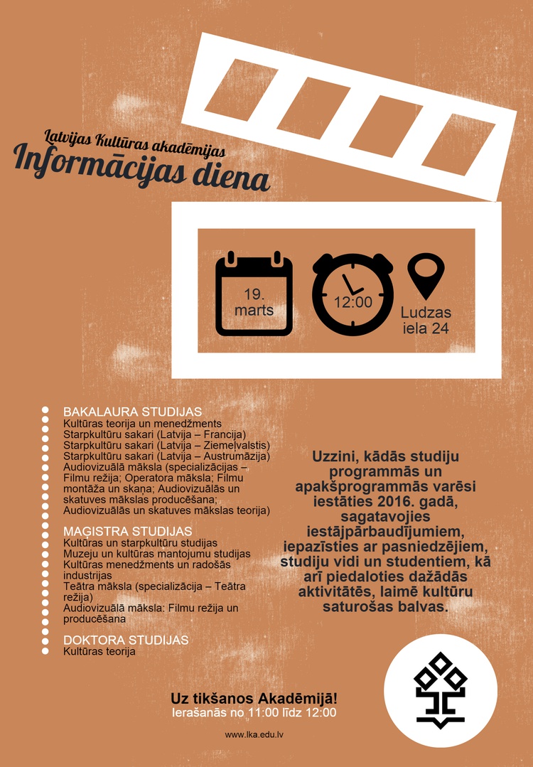 2016. gada 19. martā, sestdien, no plkst. 12:00 līdz 15:30 Latvijas Kultūras akadēmijā (Ludzas ielā 24) notiks Informācijas diena. Aicināts ir ikviens, kurš vēlas noskaidrot visu par studijām un uzņemšanu Latvijas Kultūras akadēmijā (LKA) bakalaura, maģistra un doktora studijās 2016. gadā. Informācijas dienas apmeklētājiem būs iespēja uzzināt, kādos studiju virzienos iespējams uzsākt studijas un kādas ir prasības iestājpārbaudījumos. Klātienē iepazīstoties ar pasniedzējiem, studiju procesu un studējošo pašpārvaldi, Akadēmija piedāvās izbaudīt radošo atmosfēru un vidi, kas piesaista talantīgus cilvēkus no visas Latvijas iegūt augstāko izglītību tieši LKA. Piedaloties “Radošajās orientēšanās” sacensībās, Informācijas dienas apmeklētāji varēs laimēt balvas un uzzināt interesantas lietas par Akadēmiju, tās personībām un nozīmīgākajiem notikumiem. “Sarunu koridorā” apmeklētājiem būs iespēja satikt studentus, kas dalīsies savā pieredzē par studijām un Akadēmijas vidi. Reģistrēšanās laikā, no plkst. 11:00 līdz 12:00, zālē būs iespēja vērot LKA studentu īsfilmas.
