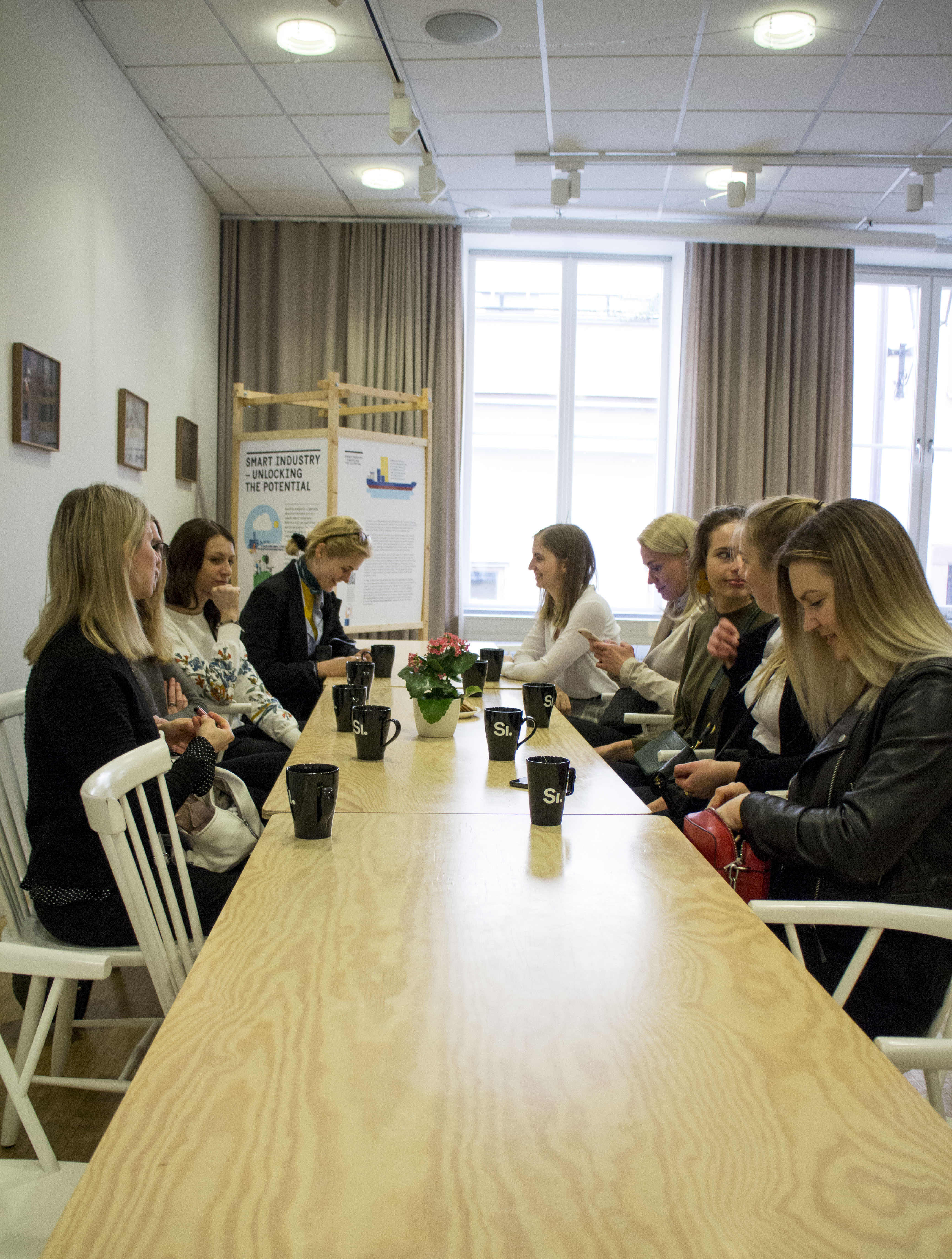 Ierodoties Zviedru institūtā, mūs laipni sagaidīja Šarlota Jūhansone un Ieva Jērnstroma. Viņas mūs pavadīja līdz virtuvei, kur mēs pagatavojām sev siltus dzērienus, jo tikšanās mums plānota fīkas formā (zviedriem kafijas pauze jeb fīka (fika) ir neatņemama dienas sastāvdaļa). Kad dzērieni visām bija pagatavoti, devāmies pie kopīga galda, lai draudzīgā atmosfērā iepazītu viena otru. Šarlota un Ieva strādā Zviedru institūtā un ir atbildīgas par zviedru valodas attīstību ārvalstīs. Aptuveni 225 universitātēs visā pasaulē ir iespējams apgūt zviedru valodu un Latvijā atrodas trīs no tām – Latvijas Kultūras akadēmija, Latvijas Universitāte un Daugavpils Universitāte.