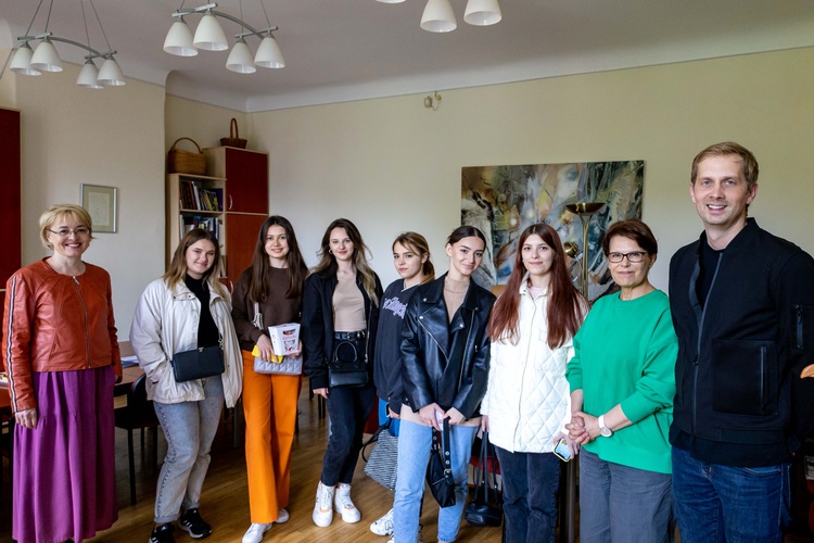 LKA rektore Rūta Muktupāvela tiekas ar studentēm un pasniedzēju Larisu Semirozumenko no Ukrainas