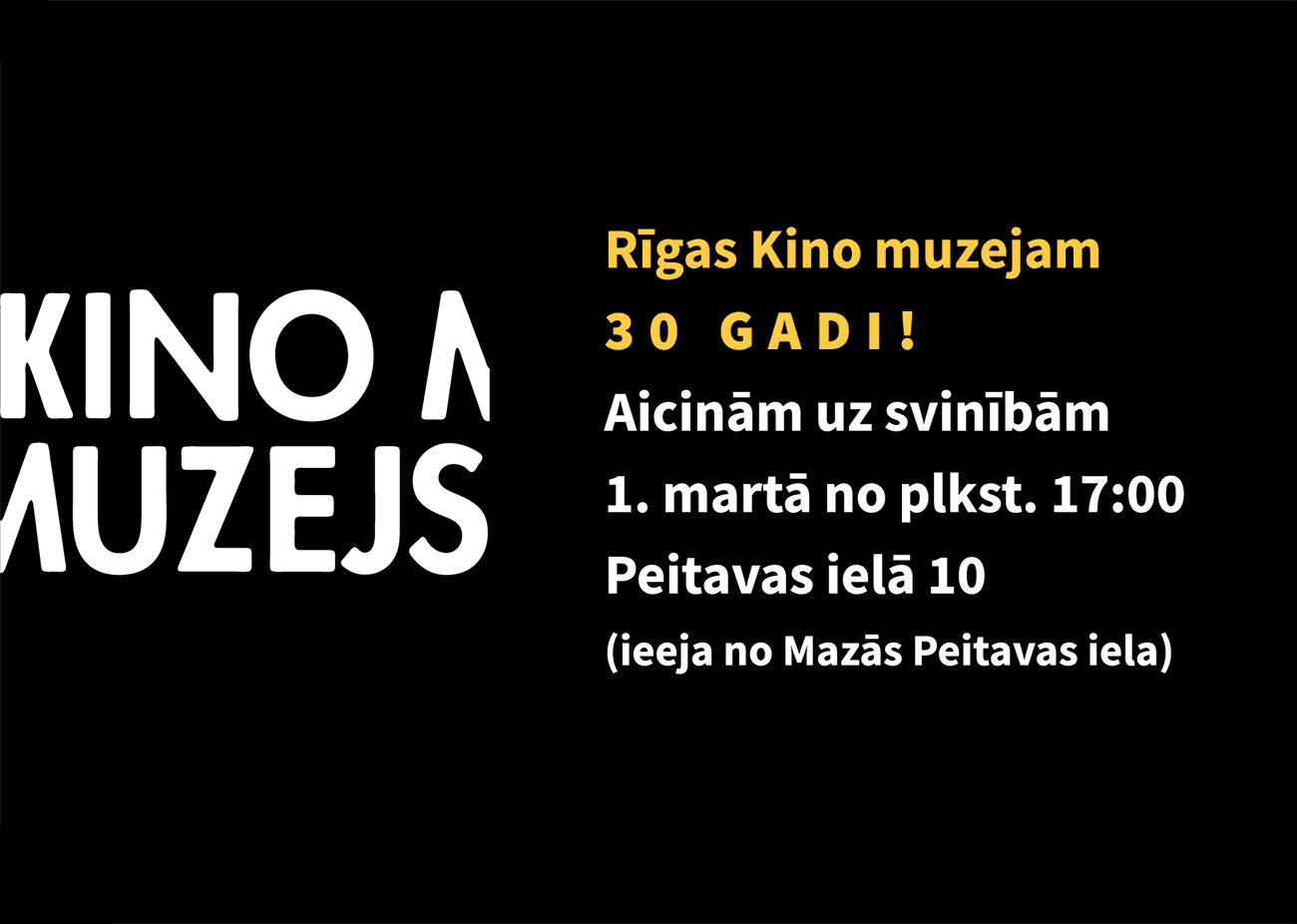 2018. gada 1. martā apritēs 30 gadi kopš Rīgas Kino muzeja dibināšanas. Rīgas Kino muzejs ir vienīgais nozarei veltītais muzejs Latvijā, kas nodarbojas ar latviešu kino mantojuma vākšanu, pētīšanu, aprakstīšanu, popularizēšanu ar izstāžu darbu, izglītojošām nodarbībām dažāda vecuma bērniem, regulāriem kino lektorijiem, diskusijām un dažāda veida pasākumiem. Kino muzeja misija ir – piedāvāt augstas kvalitātes kultūras produktus, veidot un veicināt kvalitatīvu un daudzveidīgu audiovizuālo vidi un izglītotu, kompetentu auditoriju, nodrošinot kino zināšanu pieejamību.