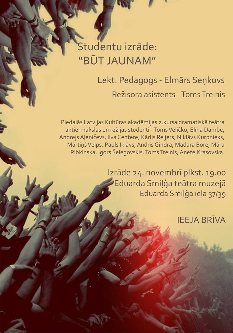 Pirmdien, 24.novembrī 19:00 Eduarda Smiļģa teātra muzejā skatāma LKA dramatiskā teātra aktiera mākslas 2.kursa studentu izrāde "Būt jaunam". Režisors – Elmārs Seņkovs, režisora asistents – režijas mākslas 2.kursa students Toms Treinis. Ieeja bez maksas.