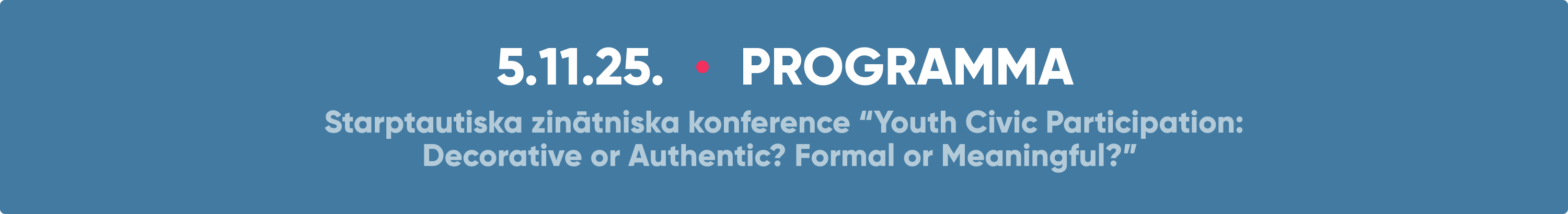 5. novembrī LKA Teātra mājā “Zirgu pasts” (Dzirnavu iela 46) plkst. 9.30–17.00 notiks starptautiska zinātniska konference “Jauniešu pilsoniskā līdzdalība: dekoratīva vai autentiska? formāla vai jēgpilna?” (Youth Civic Participation: Decorative or Authentic? Formal or Meaningful?), kas pievērsīsies jauniešu pilsoniskās līdzdalības pieredzei un iespējām demokrātijas apdraudējumu, tehnoloģisko inovāciju, un ģeopolitisko krīžu apstākļos, īpaši pievēršoties jaunām, neierastām un “citādām” līdzdalības izpausmēm. Darba valoda – angļu. Konferences noslēgumā plkst. 18.00 sadarbībā ar Baltijas Muzeoloģijas veicināšanas biedrību plānota Ninas Saimonas (Nina Simon) grāmatas “Līdzdalīgais muzejs” tulkojuma latviešu valodā atvēršanas svētki. Konference tiek organizēta valsts pētījumu programmas projekta “Jauniešu autentiskas līdzdalības priekšnoteikumi formālās un neformālās izglītības vidē” / UNFRAMED un Fundamentālo un lietišķo pētījumu projekta “Ceļā uz līdzdalīgu iesaisti muzejos: Latvijas muzejpedagoģijas prakses izpēte / MEET” ietvaros.