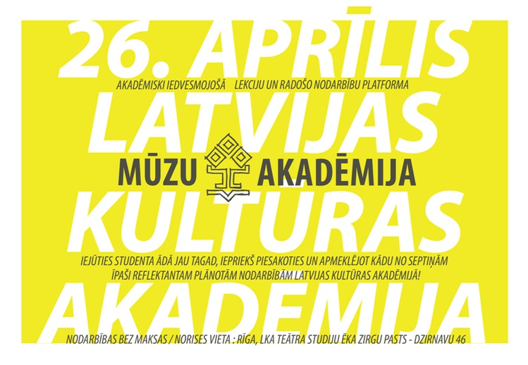 Sestdien, 26. aprīlī ikvienam interesentam, iepriekš piesakoties (pieteikšanās līdz 23. aprīlim!), ir iespēja jau laicīgi iejusties studenta ādā un apmeklēt kādu no septiņām īpaši reflektantam plānotām lekcijām Latvijas Kultūras akadēmijā, kur jau trešo gadu norisināsies akadēmiski iedvesmojošā MŪZU AKADĒMIJA.