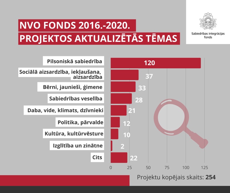 Kopumā piecu gadu periodā identificētas 82 tēmas, kam veltīti īstenotie 254 programmas projekti. Novērojams, ka ik gadu arī ir pieaudzis projektu ietvaros īstenoto aktivitāšu skaits. Ja 2016. gadā katrs projekts īstenoja vidēji 3,2 aktivitātes, tad 2020. gadā jau 5,3 aktivitātes. "Tēmu daudzveidības paplašināšanās 2020. gadā sakrīt ar plašāk definēto konkursa nolikumu, dodot iespēju projektu iesniedzējiem norādīt atbilstību četriem dažādiem darbības virzieniem. Salīdzinājumam – 2019. gadā projektus varēja īstenot vienā no diviem darbības virzieniem. Taču stratēģiskās plānošanas rezultātā, mērķtiecīgi meklējot iespēju dot NVO brīvākas rokas projektu tēmas izvēlē, īstenotie projekti kļuvuši daudzpusīgāki iekļauto aktivitāšu aspektā," skaidro Sabiedrības integrācijas fonda sekretariāta direktore Zaiga Pūce.