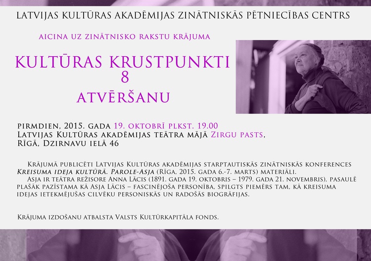 Latvijas Kultūras akadēmijas Zinātniskās pētniecības centrs aicina uz zinātnisko rakstu krājuma "Kultūras krustpunkti VIII" atvēršanu pirmdien, 19. oktobrī plkst. 19:00 Akadēmijas teātra mājā "Zirgu pasts", Rīgā, Dzirnavu ielā 46. Krājumā publicēti Latvijas Kultūras akadēmijas Starptautiskās zinātniskās konferences "Kreisuma ideja kultūrā. Parole - Asja" (Rīga, 2015. gada 6.-7. marts) materiāli.