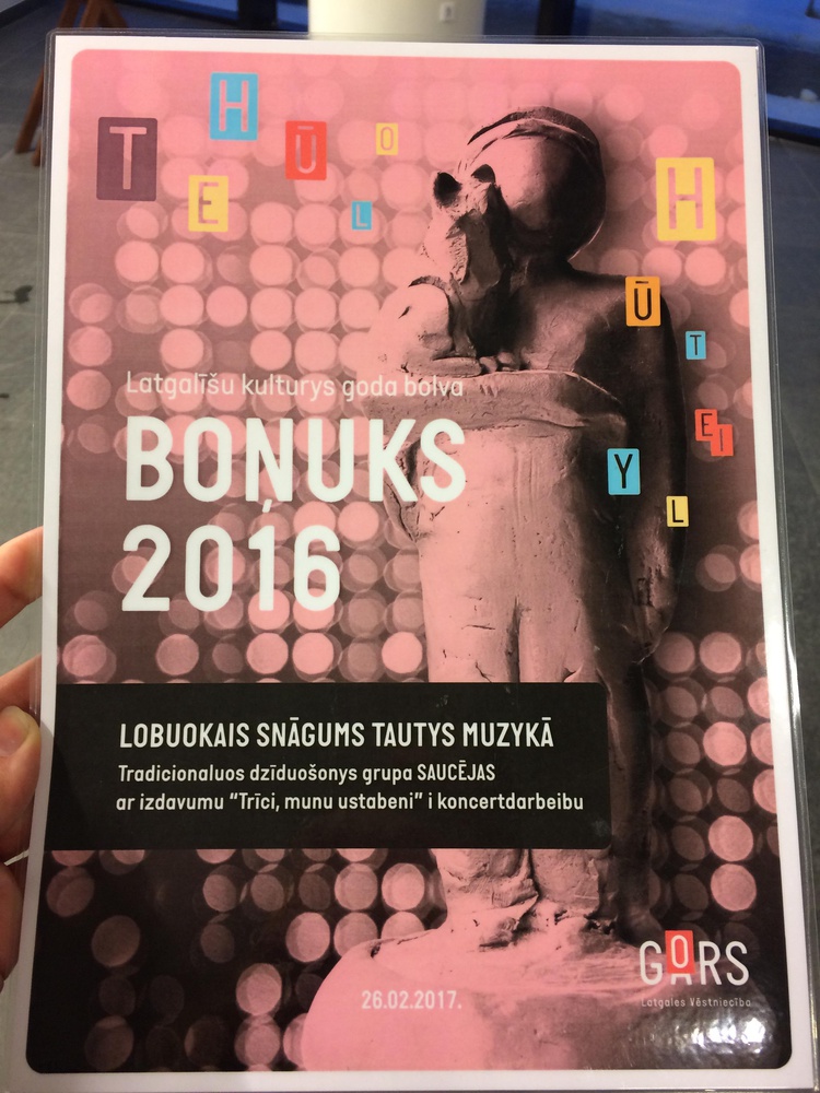 Lepojamies un sirsnīgi sveicam mūsu tradicionālās dziedāšanas grupu Saucējas ar saņemto latgaliešu kultūras gada balvu “Boņuks 2016”! Nominācijā "Labākais sniegums tautas mūzikā" mūsu Saucējas tika novērtētas par izdevumu “Trīci, munu ustabeni” un koncertdarbību!