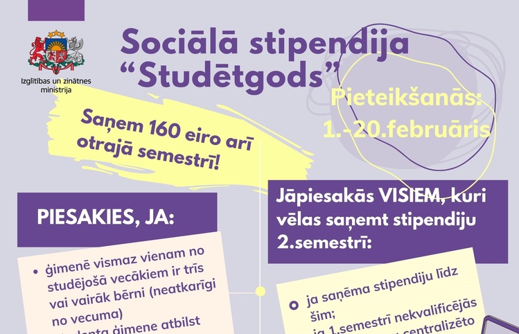 No 1. līdz 20. februārim studējošie no daudzbērnu ģimenēm var pieteikties sociālajai stipendijai “Studētgods”, kas noteikta 160 eiro mēnesī. Pieteikumu var iesniegt elektroniski, izmantojot valsts pārvaldes pakalpojumu portālu latvija.lv.