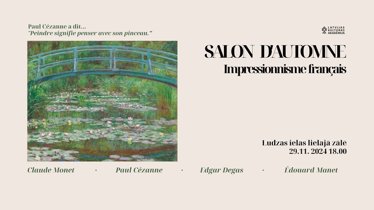Piektdien, 29.novembrī plkst. 18.00 Latvijas Kultūras akadēmijas zālē (Ludzas ielā 24) norisināsies pirmā un trešā kursa bakalaura studiju apakšprogrammas „Starpkultūru sakari” specializāciju Latvija – Francija un Latvija – Francija/Kanāda organizētais pasākums „Rudens salons 2024 – Impressionnisme Française” .