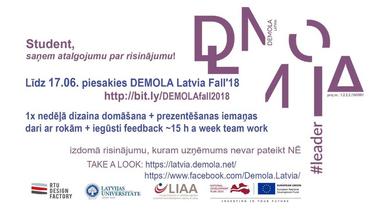 DEMOLA Latvia ir programma, kurā studentu komanda risina problēmu, kuru ir iesniedzis kāds no Latvijā lieliem uzņēmumiem. Programma norisinās no septembra līdz decembrim un šajā laikā komanda mācās un rada kopā, apmeklē konkrēto uzņēmumu un apkopo vispārējus datus, kas nepieciešami risinājuma radīšanai. DEMOLA laikā TEV trešdienu vakaros norisināsies 10 lekcijas, kas būs par darbu komandā, klientu vajadzību izzināšanu, problēmas izzināšanu, prezentācijas prasmes un prototipēšana RTU Dizaina fabrikā. Gadījumā, ja uzņēmums izvēlas nopirkt risinājumu, 100% no atlīdzības aiziet studentu komandai.