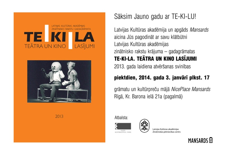 Piektdien, 2014. gada 3. janvārī plkst. 17 grāmatu un kultūrpreču mājā „NicePlace Mansards” Rīgā, Krišjāņa Barona ielā 21a (pagalmā), tiks atvērts Latvijas Kultūras akadēmijas zinātnisko rakstu krājuma – gadagrāmatas TE-KI-LA. TEĀTRA UN KINO LASĪJUMI 4. laidiens. Gadagrāmatu ar Valsts kultūrkapitāla fonda atbalstu izdod apgāds „Mansards”.