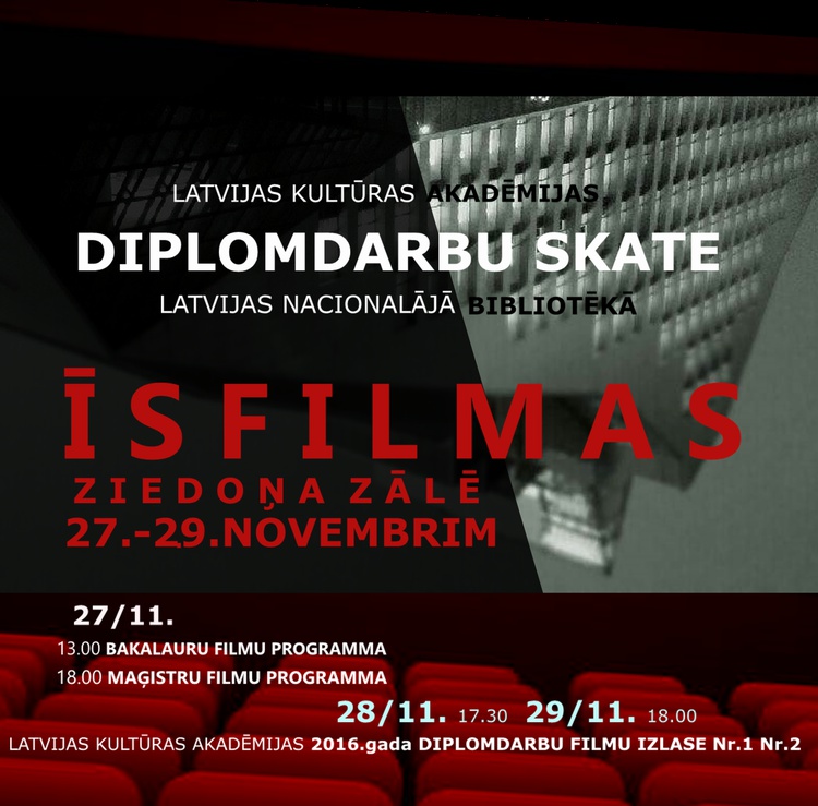 2016. gada 27., 28. un 29. novembrī Latvijas Kultūras akadēmija (LKA) sadarbībā ar Latvijas Nacionālo bibliotēku piedāvā trīs dienu filmu maratonu, kurā ikvienam interesentam bez maksas būs iespēja apmeklēt LKA 2016. gada audiovizuālās mākslas absolventu diplomdarbu filmu skati. Filmu seansi notiks Latvijas Nacionālās bibliotēkas “Ziedoņa zālē”.