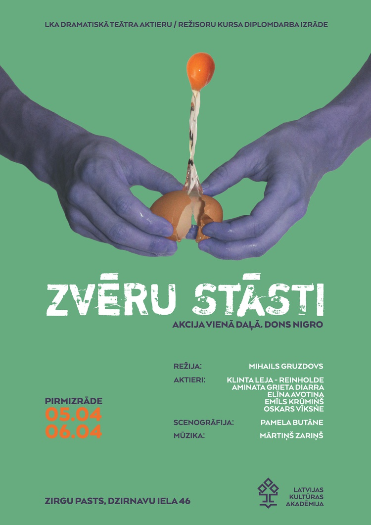 2017. gada 5. un 6. aprīlī plkst. 19.00 Latvijas Kultūras akadēmijas Teātra mājā “Zirgu pasts” notiks Dramatiskā teātra aktiera mākslas un režijas mākslas 4. kursa studentu diplomdarba “Zvēru stāsti” pirmizrāde Mihaila Gruzdova režijā.