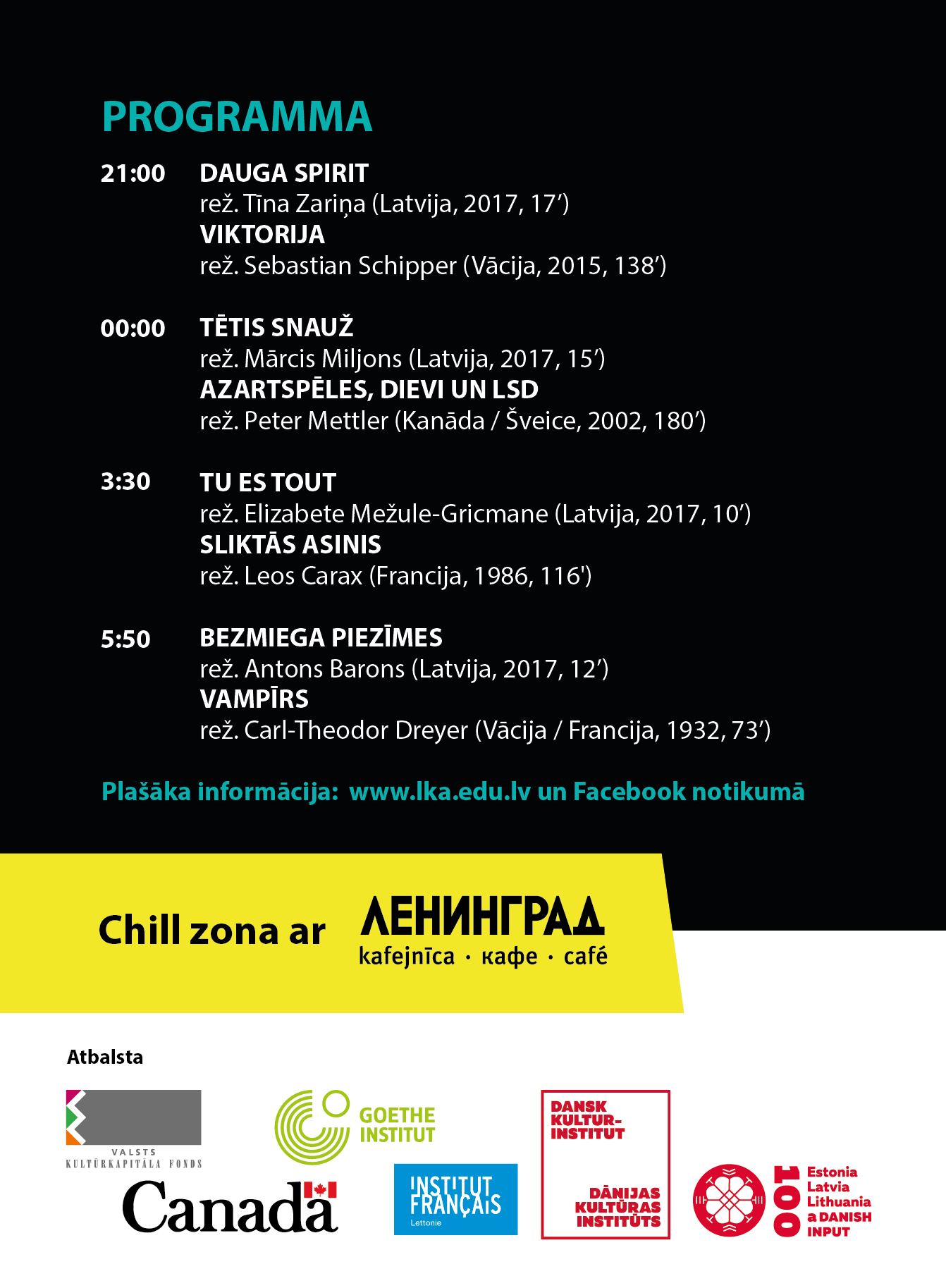 LKA Nacionālajā Filmu skolā būs iespēja noskatīties filmas no Vācijas, Kanādas, Šveices un Francijas. “Crazy Night” repertuārā tradicionāli tiek rādītas filmas no valstīm, kuru kultūru un valodu apgūst LKA studenti. Tā kā 2018. gadā studējošie tiks uzņemti bakalaura studiju “Starpkultūru sakari” specializācijās Latvija – Vācija un Latvija – Francija / Kanāda, šī gada “Crazy Night” uzmanības centrā ir filmas tieši no šīm valstīm. Apmeklētājiem būs iespēja redzēt Sebastiana Šipera “Viktoriju” (Vācija, 2015), Pītera Metlera “Azartspēles, dievi un LSD” (Kanāda, Šveice, 2002), Leo Karaka “Sliktās asinis” (Francija, 1986) un Karla Teodora Dreijera “Vampīru” (Vācija / Francija, 1932).