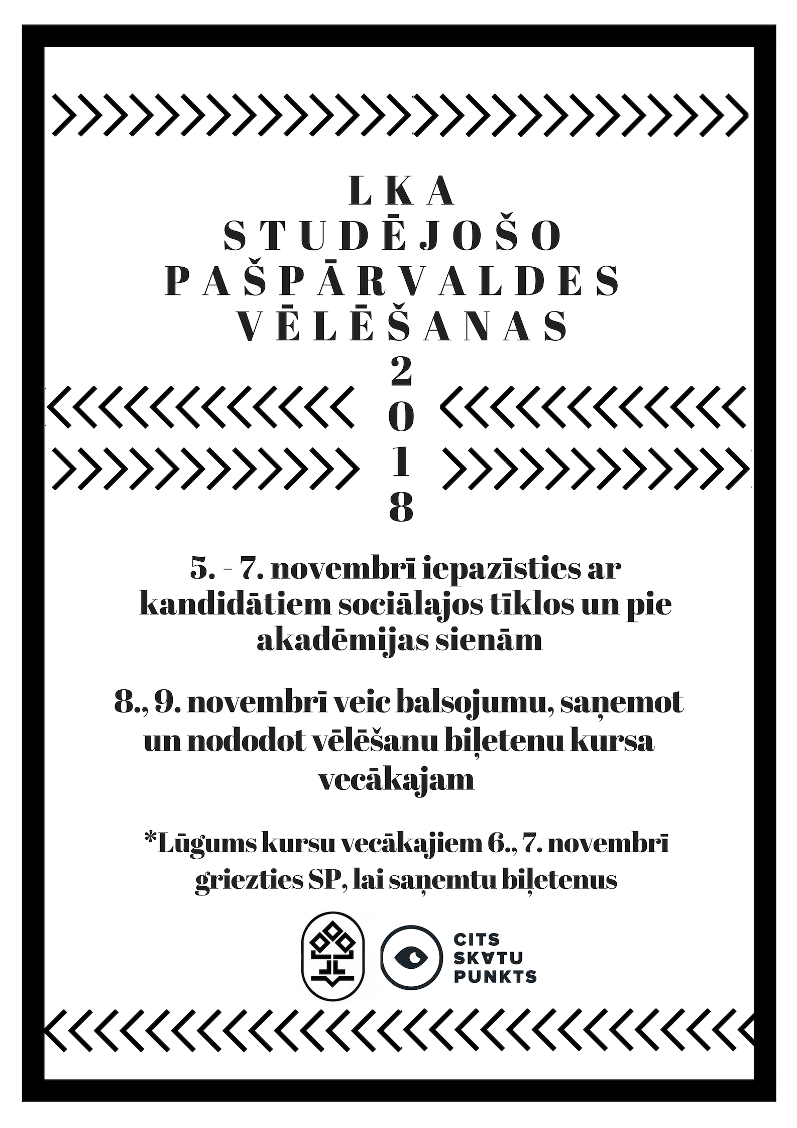 Nepaej garām, iepazīsti! Šajā nedēļā Latvijas Kultūras akadēmijā norit Studentu pašpārvaldes vēlēšanas. Ludzas ielā 24 pie sienām un FB lapā https://www.facebook.com/LKASP/ ir atrodama informācija par Studējošo pašpārvaldes biedru vēlēšanu kandidātiem. LKA student, 8.,9. novembrī veic savu balsojumu, vēlēšanu anketu vari saņemt pie sava kursa vecākā!