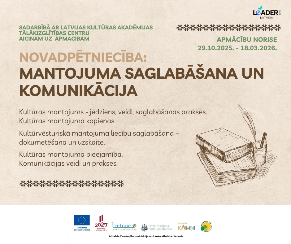 Mācības norisināsies sadarbības projekta “Novadpētniecības mantojuma ilgtspējas veicināšana” ietvaros. Sadarbības projektu īsteno Biedrības: Lauku partnerība “Lielupe”, “Bauskas rajona lauku partnerība”, “Dobeles rajona lauku partnerība” un “Partnerība “Kaimiņi””.