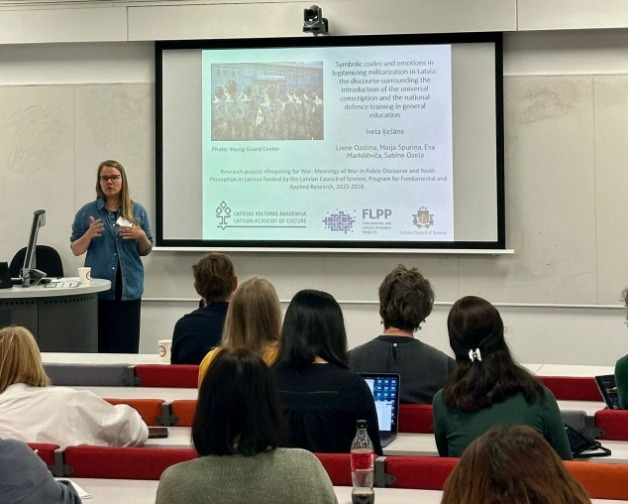 Konferencē pētnieces uzstājās ar referātu “The Shifting and Contradictory Symbolic Codes in Legitimizing Militarization in Latvia: the Discourse Surrounding the Introduction of Mandatory Conscription and Military Education Programs in General Education”, kurā dalījās ar pirmajiem rezultātiem no projekta “Gatavojoties karam: Kara nozīmes Latvijas publiskajā diskursā un jauniešu uztverē”. Izmantojot simbolisko kodu teoriju, pētnieces skaidroja, kā valsts aizsardzības dienests un valsts aizsardzības mācība kopš 2014. gada tiek atspoguļota Latvijas Sabiedriskajos medijos.