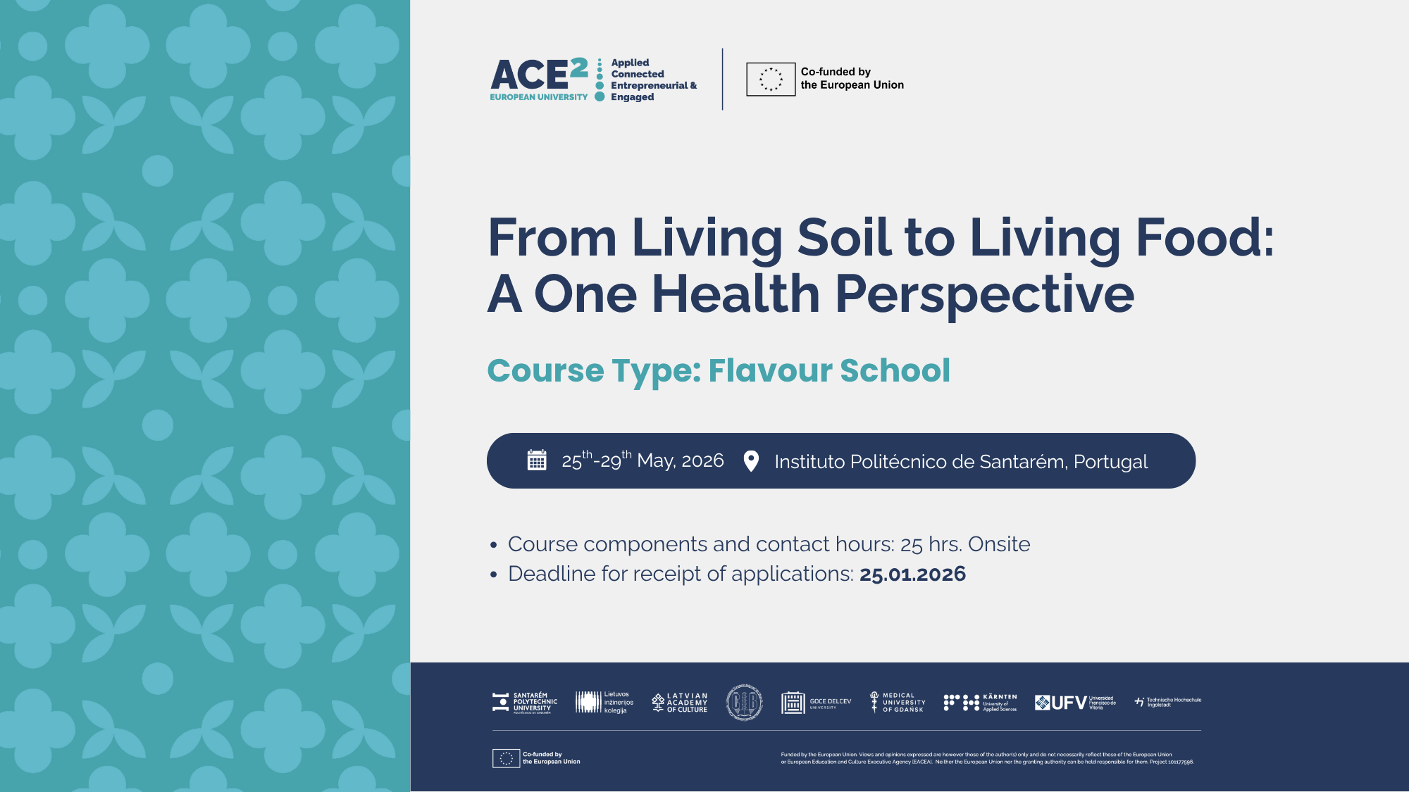 Organizē: Instituto Politécnico de Santarém sadarbībā ar Medical University of Gdansk, Lietuvos inžinerijos kolegija un University Constantin Brâncusi Târgu-Jiu Vairāk informācijas: https://www.ace2eu.eu/event/from-living-soil-to-living-food-a-one-health-perspective/